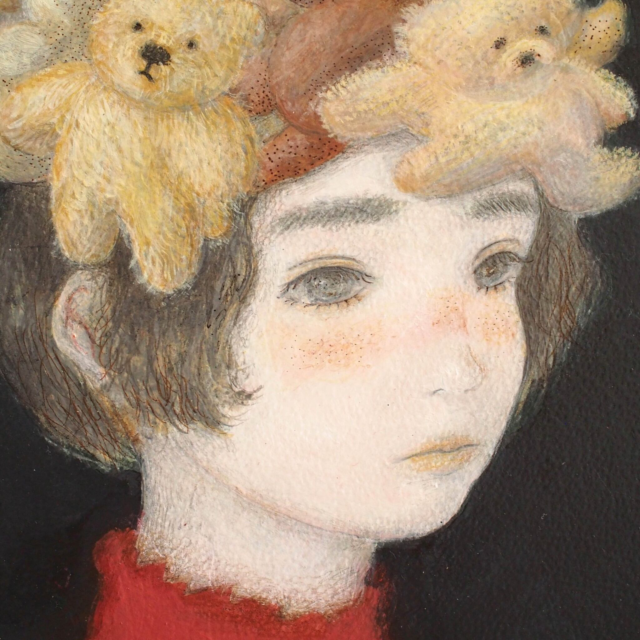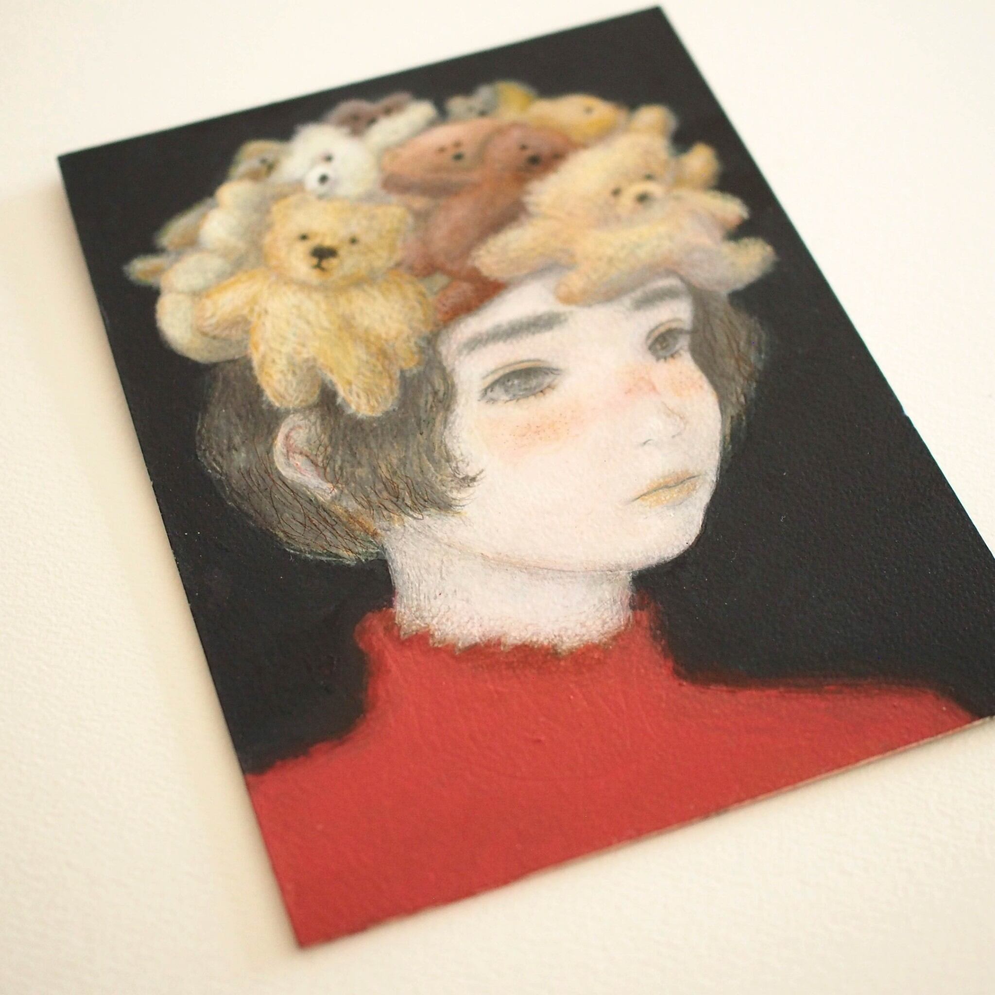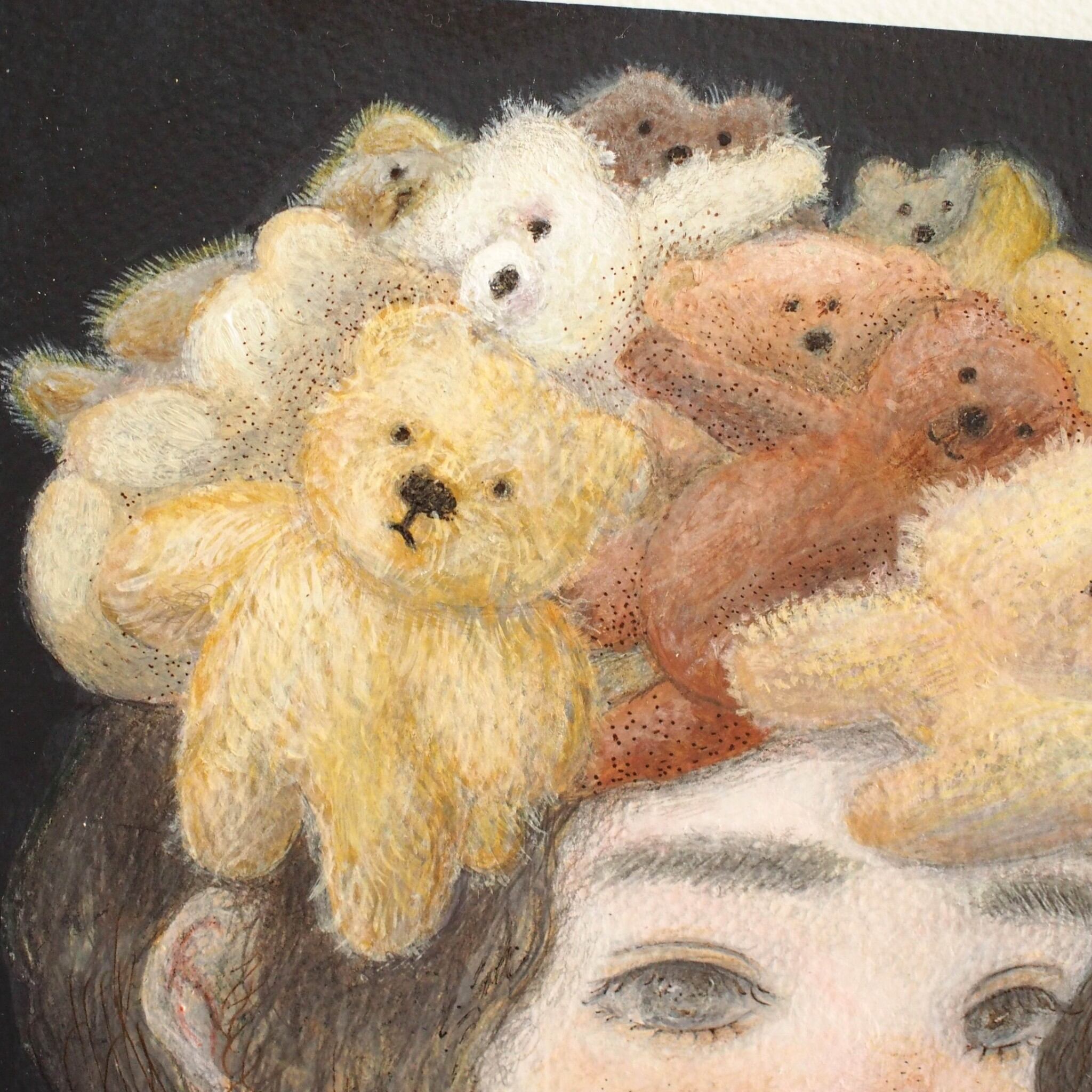 頭の上にたくさんくまをのせた女の子の絵を描きました。