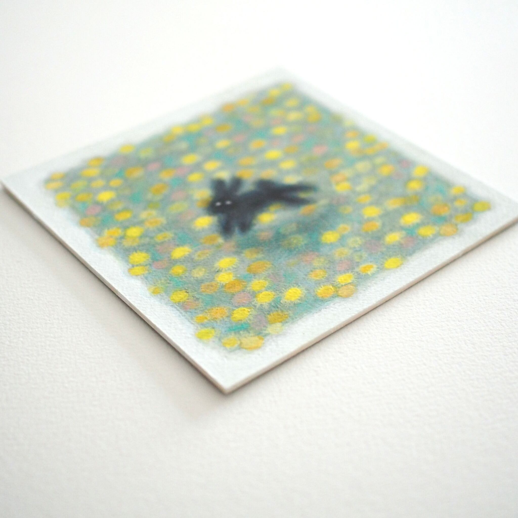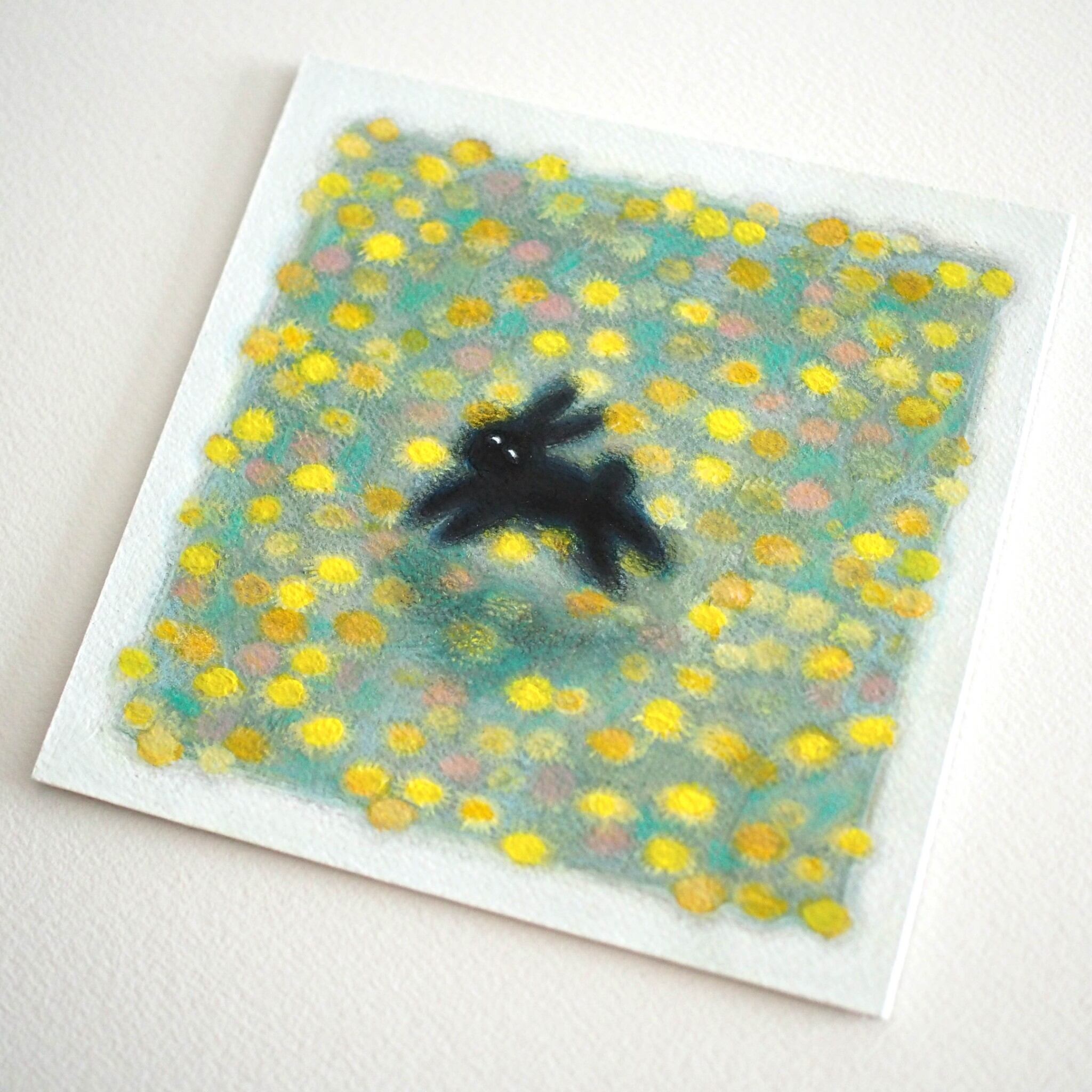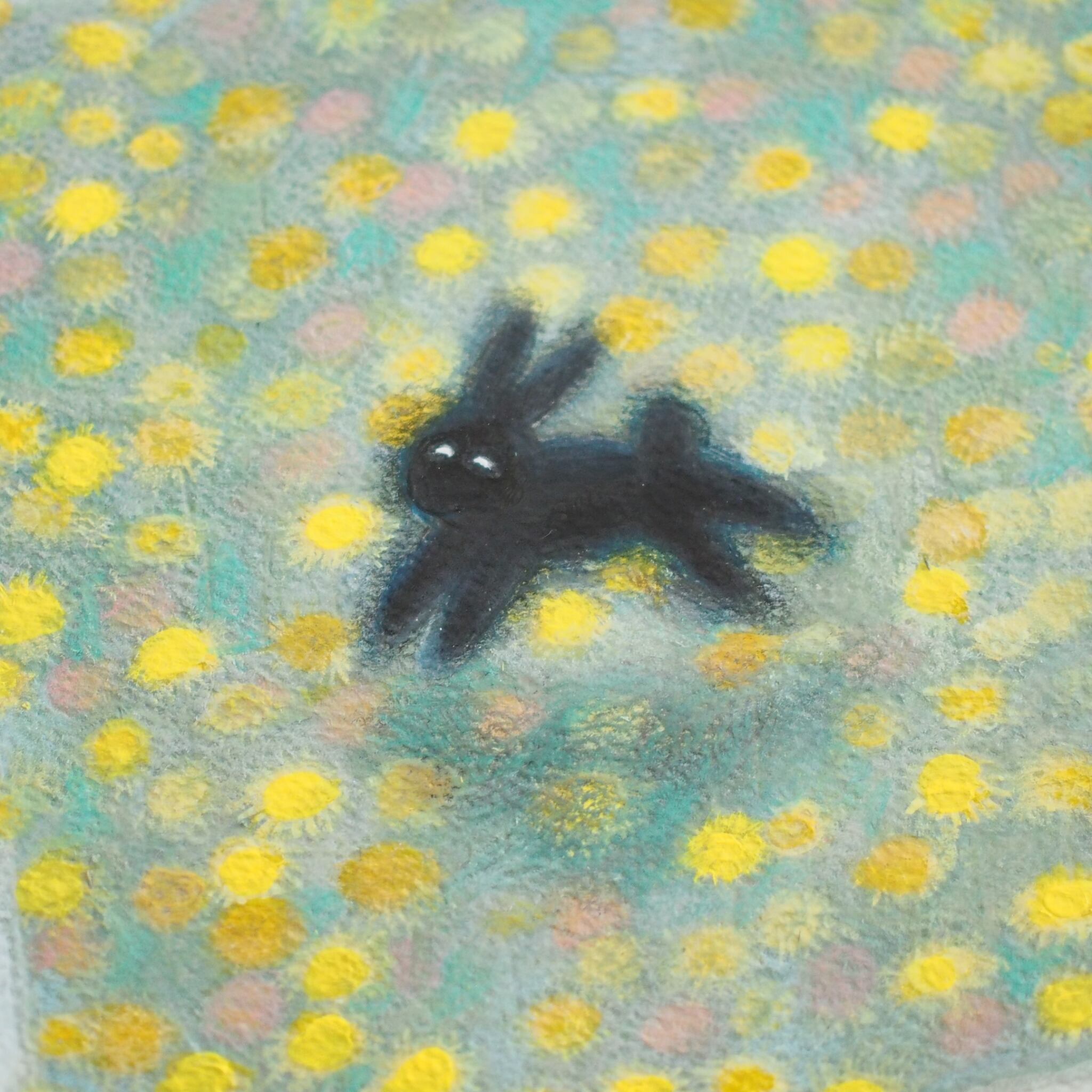 春色の花畑の中を、ひとり走るくろうさぎを描きました。